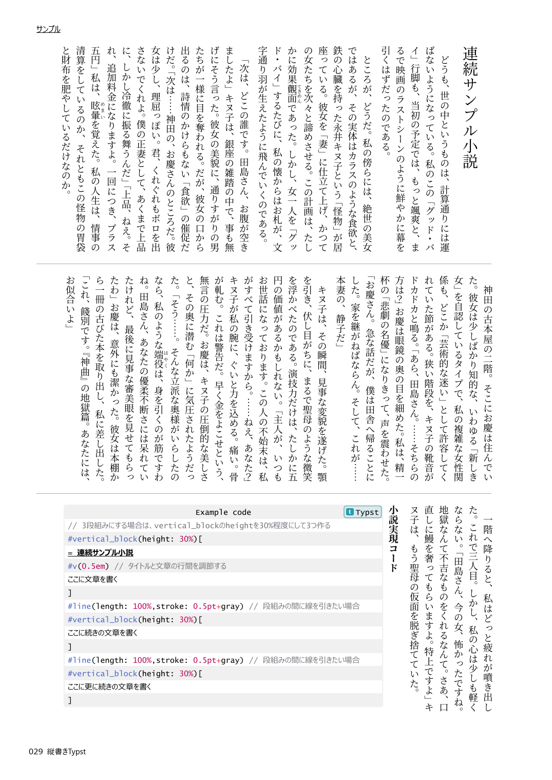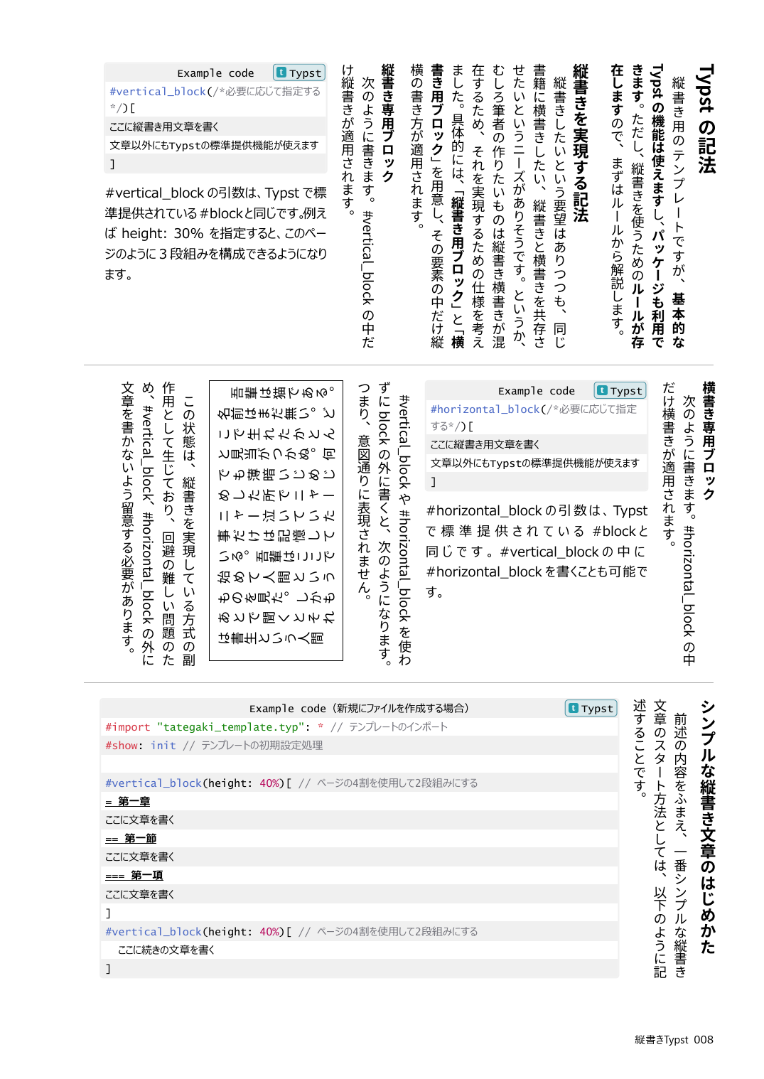 本書ではそのTypstを用いて、標準機能では対応していない縦書きに対応する方法、簡単に縦書きを実現する方法、関連機能やカスタマイズ方法を解説しています。