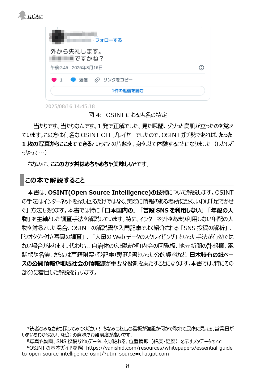 本書では、ある事例を通じて、OSINTでどこまで解るのかを体験しながら、実際に使える OSINTの技術を習得できます。